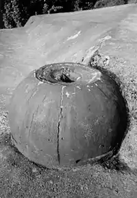 Fort Eben-Emael was a greatly enlarged development of the original Belgian defence works designed by General Henri Alexis Brialmont before World War I. Even in its larger form, the fort comprised a relatively compact ensemble of gun turrets and observation posts, surrounded by a defended ditch. This was in contrast with French thinking for the contemporary Maginot Line fortifications, which were based on the dispersed fort palmé concept, with no clearly defined perimeter, a lesson learned from the experiences of French and Belgian forts in World War I.[5] The new Belgian forts, while more conservative in design than the French ouvrages, included several new features as a result of World War I experience. The gun turrets were less closely grouped. Reinforced concrete was used in place of plain mass concrete, and its placement was done with greater care to avoid weak joints between pours. Ventilation was greatly improved, including an air filtration system for protection against gas attack, magazines were deeply buried and protected, and sanitary facilities and general living arrangements for the troops were given careful attention.[6] Eben-Emael and Battice featured 120 mm and 75 mm guns, giving the fort the ability to bombard targets across a wide area of the eastern Liège region.[2]