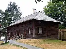 The fort's storehouse is a rectangular one and a half storey building with a hipped roof.[20] The storehouse is the only remaining structure that dates back to the original fur trading fort.[20] It was rebuilt in the 1840s after a fire which destroyed a similar building in 1839, and was the only building which survived the demise of the Fort as an active trading post. The Mavis family, who later purchased the land, used it as a barn for a number of years, until Fort Langley was recognized as a site of historic significance in 1923.