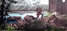 During the first few years, trade in furs with the Stó:lō, the Indigenous people (Fraser River), was surprisingly poor from the HBC point of view. Firstly, traders from Boston controlled most of the Maritime Fur Trade, travelling along the coast by boat. Such strong competition kept the price of pelts very high, much higher than Hudson's Bay was paying elsewhere. McMillan was advised by his superiors to intentionally undersell Americans in order to force them out of the region and assure a monopoly for the HBC.[5] This came in the form of a trade tariff on that Indigenous people that they identified as a trading disadvantage where five beaver skins were required to receive one two-and-a-half point HBC blanket.[9] Second, Indigenous people living along the river were not particularly interested in hunting or trapping, since they lived primarily on salmon. The Stó:lō initiated trade of salmon with the HBC, which would later become an important export of the Fort.[11][12] As they had little contact with Europeans, they were quite self-sufficient and not in serious need of European goods.[5] In the first year, guns were in high demand by the Stó:lō to fend off attacks from the Laich-kwil-tach, but when this threat died down, firearms became mainly symbolic yet infrequent items of trade.[10] 1829 and 1831 were the most successful years for the fort's fur trading operations, each year netting 2,500 skins.[9] Salmon pickling was begun by staff of the fort, creating nearly 300 barrels in 1831.[9]