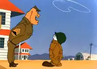 The sergeant calls Bugs forward, where Bugs introduces himself as "Private Bugs Bunny reporting, your majesty, sir!" The sergeant does not believe it is really Bugs, and sarcastically refers to himself as "Sergeant Porky Pig." However, his colonel replies "And I am Colonel Putty Tat. General Tweety Pie was asking about you, Sergeant." When the Colonel inspects Bugs and orders him to "about face," Bugs knocks over the colonel with his large shoes.