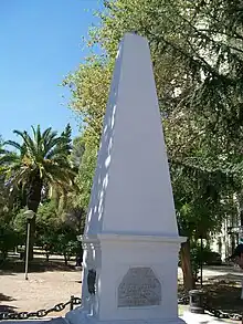 The monument stayed on its initial location until 1950, when the Chateau Gris was demolished. In 1954, it was inaugurated the San Martín Monument, placed where the pyramid was previously located.[6] The city government decided to move the pyramid some meters to the north of the San Martín Monument, on one of the squares on the current Argentina Avenue (named Eva Perón Avenue at the time), on the grounds of the former Chateau Gris.[7][5] During the relocation, a wooden box containing mostly illegible historical papers from the National Territory government was found under the original foundations.[8]