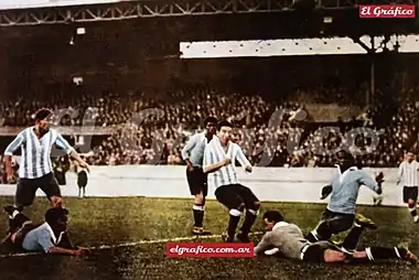 - 2010: Football historian Didier Rey, writing for the French newspaper Libéracion on July 6, 2010, wrote: "When in 1930, two years after the victory in Amsterdam, La Celeste imposed its law on Argentina again in the final of the first edition of the 1930 World Cup organized by FIFA, becoming the first triple world champion in the history of football, which was consecrated in a span of just six years."[39] Rey further added: "This required a tacit agreement between FIFA and the IOC, which stated that a victory at the Olympic games effectively designated the world champion."[40]