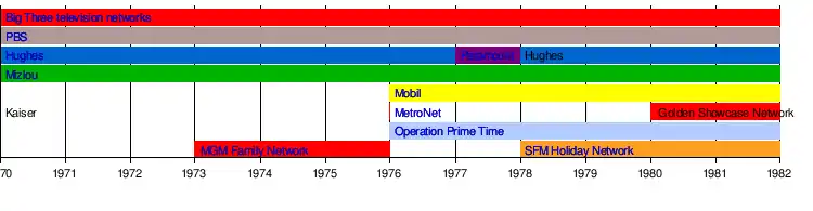 In September 1967, the Kaiser Broadcasting Company announced plans for live network operations by 1970.[16] Kaiser owned eight UHF television stations, most of them in large cities, including Los Angeles, Chicago, Cleveland, Philadelphia, San Francisco, Boston, and Detroit. The planned network never gained traction, and Kaiser sold the stations in 1977.