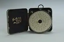 Following the patent and release of Harold's Long Scale calculator featuring two knobs on the outside rim in 1914, he designed the Magnum Long Scale calculator in 1927.[6][7] As the name "Magnum" implies, it was a fairly large device at 4.5 inches in diameter—about 1.5 inches more than Fowler's average non-Magnum-series calculators.[8] The large design meant that much larger calculations could be performed on it, "to four, and sometimes five, significant figures," according to the instruction manual.[6] Another added benefit of the Magnum's size was its readability. The instruction manual claimed the calculator's size "permits of the use of larger figures and easier reading...Another important feature is that the scales are longer and admit finer graduation."[6]