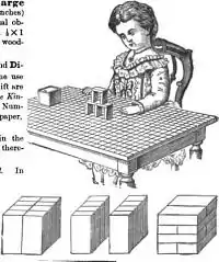 The Froebel gifts (German: Fröbelgaben) are educational play materials for young children, originally designed by Friedrich Fröbel for the first kindergarten at Bad Blankenburg. Playing with Froebel gifts, singing, dancing, and growing plants were each important aspects of this child-centered approach to education. The series was later extended from the original six to at least ten sets of gifts.[1][2]