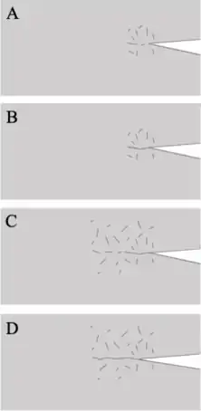 - Stage I: As the sample is loaded, the frontal process zone forms which is a zone of micro cracks ahead of the main crack tip. The crack accelerates through this zone until the crack tip is ahead of the formed microcracks. Crack propagation slows when the crack tip is ahead of the microcrack zone, where the region of microcracks exert a compressive stress on the crack tip.[4]