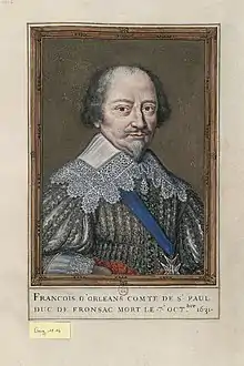 François III d’Orléans (1570 – 1631), Duke of Château-Thierry and of Fronsac, Count of Saint-Pol was governor of Orléans, Blois and Tours and a general of the French Wars of Religion. He was the second born son of Eleonor of Neuchâtel.