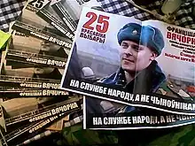 It has been reported that on 16 January 2009, Viačorka was forcibly conscripted into the Armed Forces of Belarus by the authorities,[14] despite having been found medically unfit. Several other youth activists, such as Ivan Šyła, were also drafted.[15] As of February 2009, he was stationed in the air defence unit 48694 in Mazyr, Gomel Region. In the course of his training, it is alleged that he has been subjected to harassment by senior military figures in order to make him speak Russian rather than Belarusian, although both are legal for use in the military.[16] As a soldier, Viačorka fought for soldiers’ rights and the rights of local residents. On April 14, 2010 Viačorka was released from the army because of health problems. During his military service Viačorka participated as a candidate in local elections to Mazyr City Council.[17]
