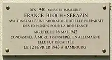 France Bloch-Sérazin (French pronunciation: [fʁɑ̃s blɔʃseʁazɛ̃] ⓘ; (21 February 1913 – 12 February 1943) was a chemist and militant communist who fought in the French resistance against German occupation during World War II.