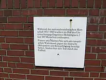 On the site of the Hamburg prison, a plaque on the back wall of the detention center commemorates two members of the Resistance who were killed there.[4] A translation of the inscription reads: