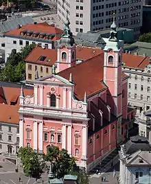 The Franciscan Church of the Annunciation (Slovene: Frančiškanska cerkev Marijinega oznanjenja or commonly Frančiškanska cerkev) is a Franciscan church located on Prešeren Square in Ljubljana, the capital of Slovenia. It is the parish church of Ljubljana - Annunciation Parish. Its red colour is symbolic of the Franciscan monastic order.[1] Since 2008, the church has been protected as a cultural monument of national significance of Slovenia.[2]