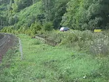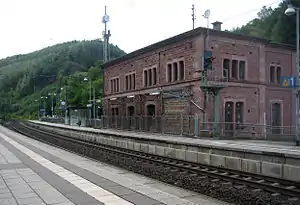 Next to the two through tracks, there was a dead-end track in the northern part of the station and another freight track in the southern part.[31] In the eastern railway station area, there was a signal box on the north side of the railway tracks.[32] In the meantime the facilities have been dismantled and the station has been reclassified as a Haltepunkt (halt).[33] Remains of the northern dead-end track still exist. In addition to the platform, there was an island platform between the two main tracks, which was later replaced by an external platform on the southern side of the station.[30]