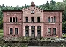 The entrance building was built during the time of the line's construction in the Italian style of architecture as many—some replaced in the meantime—of the entrance buildings on the then Ludwig Railway.[8] It is built in the style of a Schloss (palace).[25][26] For a village the size of Frankenstein, it was architecturally very sophisticated, which was due to the fact that Denis had settled locally in the village.[27] In contrast, the entrance buildings of Kaiserslautern and Neustadt were made of wood only.[28]
