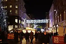 The Christmas Market and Craft Fair is located in Centenary Square, Chamberlain Square, New Street, and Victoria Square.[2] It is the largest such market outside Germany and Austria,[4] attracting over 3.1 million visitors in 2010,[5] over 5 million visitors in 2011,[6] almost 5 million visitors in 2013[7] and over 5.5 million visitors in 2014.[8] German food and drink such as Bratwurst and Glühwein are available.