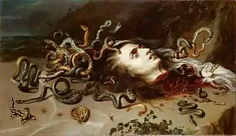 Collaborations with Rubens were particularly frequent. Snyders' expressiveness and ability to render different textures of furs and skins excited the admiration of Rubens. Rubens frequently employed him to paint animals, fruit and still life in his own pictures.[5] Snyders developed a particularly close collaborative relationship with Rubens between 1610 and 1640. Their collaborative efforts are well documented. In the early period of their collaboration, Rubens would paint an oil sketch of the complete composition and mark out clearly where Snyders would have to put his contribution. This has been documented for the painting The Recognition of Philopoemen. It is possible that in this early period Rubens was not sure about Snyders' compositional skills and wanted to show him the way. In the later Prometheus bound the process was reversed and Snyders made a sketch leaving the space for the figure by Rubens.[16] The Recognition of Philopoemen is considered the first Baroque still life with figures.[17] A famous collaboration between Rubens and Snyders is the Medusa (Kunsthistorisches Museum, Vienna). Painted around 1613-1617/1618, this small-scale work showed that Snyders' manner was not only well suited to Rubens' large pieces, but also adaptable to his smaller-scale works.[18] Rubens relied on Snyders to create the visual richness that went hand in hand with his Baroque style, which stressed abundance and bounteousness. The two artists' brushwork was so close that contemporaries had difficulty distinguishing their contributions in collaborative works.[7]