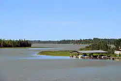 Frederick House Lake is about 20 miles northeast of Timmins, Ontario, about 5 miles north of Ontario Highway 101 and 5 miles southwest of the Ontario Highway 11 and about 16 miles northwest of the point where the two highways meet. Since the Frederick House River is a north-flowing tributary of the Abitibi, it is somewhat west of the main canoe route from James Bay up the Abitibi River, portage to Lake Timiskaming and down the Ottawa River to Montreal. In June 1784 Philip Turnor was sent from Moose Factory up the Abitibi to establish a post somewhere upriver. His boats proved defective and he was forced to winter at the junction of the Frederick House and Abitibi rivers. Next spring he went up the Frederick House and established a post on the lake where he remained as master until 1787. It was temporarily closed from 1795 to 1798. The post proved difficult to supply because both the Frederick House and Abitibi Rivers are difficult for canoes. Montreal-based traders sent men to divert Indians away from the fort. In January 1812 there was a proposal for the HBC to give up its post on Lake Abitibi in exchange for the Northwest Company's withdrawal from Frederick House. This was not acted upon because of the following. In December 1812 a man called Capascoos murdered everyone at the post (3 Europeans and 9 Indians). He apparently spent the winter there and murdered any arrival that might tell the tale. When two men arrived from another post they found Frederick House deserted and looted. When the snow melted 12 bodies were found. A reward was offered for Capascoos, but he was never caught. The post was never re-built. In 1911 a steam shovel building the Ontario Northland Railway unearthed the remains of the fort and several skeletons were found in shallow graves. The site is said to have been on Barber's Bay, but the southern part of the Lake was drained when the Frederick House River was diverted. There is a marker on highway 101.[3]