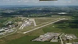 Frederick Municipal Airport's construction began on March 26, 1946.[11] It replaced Detrick Field, which would become Fort Detrick and lose its aeronautical function.[12] The airport opened on April 17, 1946, with the arrival of a Stinson aircraft,[13] although the airport was not open for general use until the grading and paving of the runways completed later.[14] The airport was dedicated on May 1, 1949.[15] At the dedication ceremony, two plaques were unveiled; one honored Frederick County residents who served their country in World War II, and the other honored Lieutenant William T. Delaplaine III, the first Frederick County pilot to lose his life in World War II.[15]