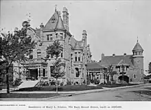 The house was designed by prominent Columbus architect Herbert A. Linthwaite. It had three stories and about 12,000 square feet (1,100 m2) of space, with a carriage house measuring 5,700 square feet (530 m2).[21][7] The home's exterior was primarily made up of green-colored stone, which included a high percent of soapstone.[19][25][33] The stone was reportedly mined either in Bucks County, Pennsylvania, or at the Marble Cliff Quarry in Columbus.[7][34] Mary L. Frisbie named the house the "Greenstone Mansion" due to the materials used, and neighborhood children were told the tale that Schumacher had so much money that the stones of his house turned green.[1] The only other building in the city made with the stone was the Broad Street United Methodist Church, located several blocks west of the house.[35] The house was one of the most elaborate in Columbus at the time,[1] and was built at a time when the wealthy enjoyed elaborate French, Italian, and Gothic architecture, and thus the building and its coach house displayed many features popular at the time. These included a square tower at the front of the building, with a smaller tower corbeled onto its corner. Other towers, false facades, chimneys, and peaked roofs added to a "skyline" of sharp finials.[4] The house has been varyingly described as following either the Victorian,[15] Jacobean,[35] or Richardsonian Romanesque styles.[7]