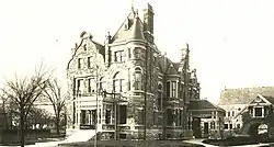 In 1901, Frisbie sold the house to Frederick W. Schumacher, who was an immigrant who made a fortune as the head of advertising for the Peruna Drug Manufacturing Company.[7] Schumacher and founder Samuel B. Hartman (his father-in-law) were the most impactful in the company; Schumacher's advertising efforts made the drug remarkably popular and a household name.[8][4] Schumacher also became a prominent Columbus patron of the arts, and served as president of the Columbus Gallery of Fine Arts from 1904 to 1923.[7] The sale went through on March 8, 1901; the announcement in The Columbus Dispatch on the following day clarified that the sale was to Schumacher, and not to Hartman, as the paper had previously announced.[9] Schumcher had lived in Waco, Texas for much of his early life, and had married Hartman's daughter, Maribel Hartman, in 1895, at the Hartman home. In 1897, the couple moved from Waco to Columbus, taking up temporary residence in the Hartman home, and later, at 71 Winner Avenue. In 1901 the couple moved to 750 East Broad Street, what would become known as the Schumacher mansion. The couple remodeled the house, adding an iron fence as well as a porch with polished pink marble columns.[4] Schumacher also purchased adjacent lots, so that the house's grounds would be bounded by four streets.[10]