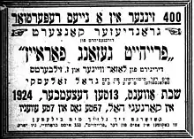 Another of the choir's early successes was its February 1926 performance of Schaefer's Tsvey brider ("Two brothers", based on a work by I. L. Peretz) to an audience of 4000 at the Mecca Temple.[7][11] Schaefer followed it with another successful oratorio, Di tsvelf (The twelve) which was performed at Carnegie Hall in April 1927.[7] The main choir often performed jointly with its affiliated choirs; its fifth jubilee concert at Carnegie Hall in April 1928 was staged together with a branch from Paterson, New Jersey which Schaefer also directed.[7][12]