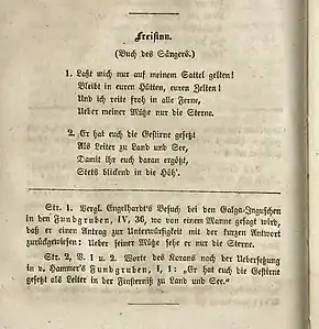 The first German researcher to reveal the connection between the Ingush man's phrase and the poem was Christian Friedrich Wurm in his Commentary on Göthe's West-Eastern Diwan.[4] This would later on be confirmed in the works of Joseph Kürschner,[5] Dieter Borchmeyer.[6] and Martin Mosebach.[7]