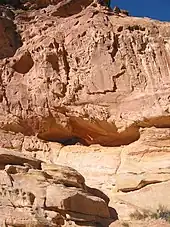 John Steward, writing in his journal on August 4, 1871 during the Colorado River Exploring Expedition, reported having found two graves and speculated that, "They may be those of the Moquis tribes which evidently inhabited this section of the country at some time and were driven out many years ago. Their ruins are everywhere to be found where the country is rendered inhabitable by garden spots along the river."[4] "Moqui" is a Hopi autonym borrowed into other adjacent languages. The Ute referred to the former inhabitants of the many village ruins in their territory as the "mocutz".[5]