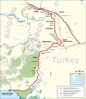Regarding the Edirne Karaagaç railway enclave so to speak, the CO retained operating rights over the section Svilengrad to Pythion to be able to reach Edirne and even Svilengrad. On the other hand, the CFFH retained operating rights through the Edirne section of the line to access the Greek part of the line past Edirne, through to Svilengrad. When the Turkish part of the CO was sold to the Turkish railways, these operating rights were also sold, enabling TCDD to reach Edirne with its own motive power, albeit with a CFFH driver. Likewise, when Hellenic State Railways (SEK) took over from the CFFH, they kept the operating right through Edirne Karaagaç. Operational working was facilitated by a provision in the treaty of Lausanne allowing for trains to cross the borders in and out of Karaagaç without border control not custom taxes.[6] These rights survived until 1971 when TCDD inaugurated its own line from Pehlivanköy to Edirne & Svilengrad fully on Turkish territory.
