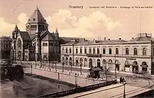 An old railway station of the Compagnie des chemins de fer de l'Est in Strasbourg (right) from a 1900 postcard. The German text translates to Synagogue and Market Hall.
