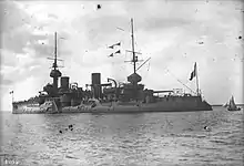 In November, she and the armored cruiser Amiral Charner were sent to relieve the British armored cruisers HMS Black Prince and HMS Warrior as guard ships at the northern entrance to the Suez Canal.[27] She remained there only briefly, however, before she was ordered north to the Dardanelles to relieve the battleship Vérité on 20 December. Over the coming months, the Triple Entente amassed a large fleet tasked with breaking through the Ottoman defenses that guarded the straits. During this period, before the start of major offensive operations, the Anglo-French fleet alternated between anchorages at Tenedos and Mudros Bay on the island of Lemnos, and it was tasked with patrolling the entrance to the straits to ensure that Goeben—which had by then been transferred to the Ottoman Navy as Yavuz Sultan Selim—did not attempt to sortie. On 1 February 1915, the ships sailed to Sigri on the island of Lesbos.[28]