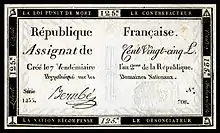 A kind of paper money was reintroduced by the Caisse d'Escompte in 1776 as actions au porteur, denominated in livres. These were issued until 1793, alongside assignats from 1789. Assignats were backed (in theory) by government-held land. Like the issues of the Banque Royale, their value plummeted.