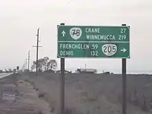 Oregon Route 205 (OR 205) is a state highway in Harney County, Oregon, running from Roaring Springs Ranch to OR 78 near Burns. OR 205 is known as the Frenchglen Highway No. 440 (see Oregon highways and routes). [2] It is 73.35 miles (118.05 km) long and runs north–south, connecting the Malheur National Wildlife Refuge to Burns. The highway has also been designated the High Desert Discovery Scenic Byway by the Bureau of Land Management. Part of OR 205 also is used in the Steens Mountain Back Country Byway, a loop road around Steens Mountain.[3][4]