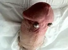 A frenum piercing is a type of body piercing located on the underside of the shaft of the penis.[1] A series of parallel frenum piercings is known as a frenum ladder. A frenum ladder may be extended to include lorum piercings, hafada piercings and guiche piercings.