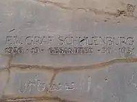Schulenburg was born in Kemberg, in the Prussian Province of Saxony, to Count Bernhard Friedrich Wilhelm von der Schulenburg, he was from the Brandenburgish House of Schulenburg, which was part of the Uradel (or old nobility). Friedrich-Werner was distantly related to the 17th-Century Saxon Generalfeldmarschall Count Johann Matthias von der Schulenburg and was a cousin to Friedrich Graf von der Schulenburg. After one year serving in the army, he studied law in Lausanne, Munich, and Berlin, and in 1901 joined the Foreign Office's consular service as a junior civil servant (Assessor). By 1903, he had been appointed as vice-consul at Germany's consulate general in Barcelona, and in the years that followed he found himself working at consulates in Lemberg, Prague, Warsaw, and Tbilisi. With the outbreak of the First World War in 1914, Schulenburg returned to the military, and after the First Battle of the Marne was promoted to captain in October 1914 and put in charge of an artillery battery. In 1915, he was posted as German liaison officer to the Ottoman Army on the Armenian Front. In October 1915, he arrived in Erzurum and succeed Max Scheubner-Richter as the German Vice Consul.[3] In 1916, he took over the command of the Georgian Legion in the struggle against the Russian Empire until its collapse in 1917. During his time in the military, he received the Iron Cross and some high Ottoman honours. After the German Empire's collapse, he was captured by the British and interned on the Mediterranean island of Prinkipo (now called Büyükada). He returned to Germany in 1919. Schulenburg was then reinstated in the Foreign Office Service and became German consul in Beirut.