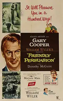 Friendly Persuasion is a 1956 American Civil War drama film produced and directed by William Wyler. It stars Gary Cooper, Dorothy McGuire, Anthony Perkins, Richard Eyer, Robert Middleton, Phyllis Love, Mark Richman, Walter Catlett and Marjorie Main. The screenplay by Michael Wilson was adapted from the 1945 novel The Friendly Persuasion by Jessamyn West. The film tells the story of a Quaker family in southern Indiana during the American Civil War and the way the war tests their pacifist beliefs.