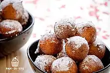 Frittole is an Italian fried doughnut type of food made from dough, typically with raisins, orange peels, or lemon peel in it. They are eaten in and around the Friuli-Venezia Giulia and Veneto regions. However, they originated around the Giuliani areas of Trieste and Venice. Many variations are common, including custard and chocolate fillings. [1][2] They are fried in oil until golden brown and sprinkled with sugar. They are included in the British Museum Cookbook by Michelle Berriedale-Johnson[3] and a book about Venice from 1879.[4] A Vendita Frittole is a fritter and liquor shop. [5]