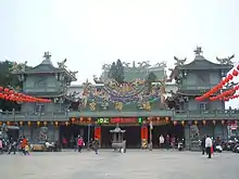 Fuhai Temple is divided into a main hall and a rear hall. Mazu is seated in the main hall accompanied by her guardians Qianliyan and Shunfeng'er. The rear hall is three-stories tall that includes altars for Guanyin, the Eighteen Arhats, and the Jade Emperor, as well as lodging for visiting pilgrims.[2]