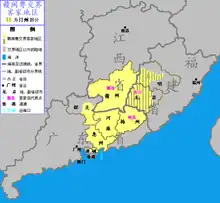 The Kinmen-Matsu region consists of two counties, Kinmen and Lienchiang (Matsu), which belong to Fujian Province of Taiwan, but are actually under the jurisdiction of the Republic of China government in Taipei.[32] Kinmen is located outside the Jiulong River Estuary, overlooking the Xiamen Bay Estuary. It is only 1.8 kilometers away from Dacheng Subdistrict, which is under the jurisdiction of the People's Republic of China, and 210 kilometers away from Taiwan Island. It includes twelve large and small islands including the Main island (Large Kinmen) and Lesser Kinmen, and has a total area of about 150 square kilometers,[33] and was a battleground for military action across the Taiwan Strait.[34] Matsu is located outside the Min River estuary in Fujian Province. It is about 16 nautical miles away from Fuzhou in the west, 114 nautical miles from Keelung, and 152 nautical miles to Kinmen to the south. The Matsu Islands extend 54 kilometers from north to south, with a total area of 28.8 square kilometers, including 36 large islands and reefs.[35]