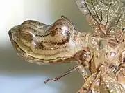 Fulgora laternaria can reach a length of 85–90 millimetres (3.3–3.5 in), with a wingspan up to 100–150 millimetres (3.9–5.9 in). This insect has a protuberance at its head as long as 10–15 millimetres (0.39–0.59 in), looking like a peanut and showing false eyes to resemble that of a lizard or a serpent. The insect was originally - and mistakenly - believed to be luminescent. When attacked, it protects itself by displaying large, yellow, fake eyes on its hind wings to frighten the aggressor, and releases a foul-smelling substance. Adults can be found from June to December. They feed on the sap of plants, mainly from some trees as Hymenaea courbaril, Simarouba amara and Zanthoxylum species. It will generally remain camouflaged on a tree trunk during the day.[1][2]