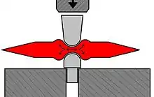 In bladesmithing, fullers are often used in pairs. The upper fuller has a flat surface for striking with a hammer, while the lower fuller has a square peg that fits into the anvil. The fullers displace material in the blade, causing it to move sideways and bulge outward from the surface.