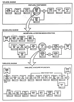 FFBDs can be developed in a series of levels. FFBDs show the same tasks identified through functional decomposition and display them in their logical, sequential relationship. For example, the entire flight mission of a spacecraft can be defined in a top level FFBD, as shown in Figure 2. Each block in the first level diagram can then be expanded to a series of functions, as shown in the second level diagram for "perform mission operations." Note that the diagram shows both input (transfer to operational orbit) and output (transfer to space transportation system orbit), thus initiating the interface identification and control process. Each block in the second level diagram can be progressively developed into a series of functions, as shown in the third level diagram on Figure 2.[8]