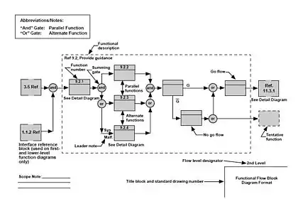 A functional flow block diagram (FFBD) is a multi-tier, time-sequenced, step-by-step flow diagram of a system's functional flow.[2] The term "functional" in this context is different from its use in functional programming or in mathematics, where pairing "functional" with "flow" would be ambiguous. Here, "functional flow" pertains to the sequencing of operations, with "flow" arrows expressing dependence on the success of prior operations. FFBDs may also express input and output data dependencies between functional blocks, as shown in figures below, but FFBDs primarily focus on sequencing.
