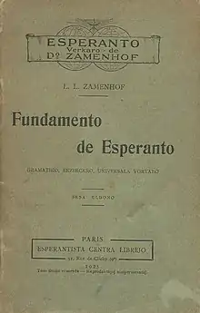 Fundamento de Esperanto (English: Foundation of Esperanto) is a 1905 book by L. L. Zamenhof, in which the author explains the basic grammar rules and vocabulary that constitute the basis of the constructed language Esperanto. On August 9, 1905, it was made the only obligatory authority over the language by the Declaration of Boulogne at the first World Esperanto Congress. Much of the content of the book is a reproduction of content from Zamenhof's earlier works, particularly Unua Libro.