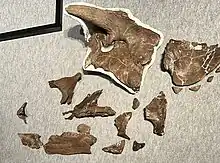The Judith River Formation has produced the remains of several dinosaurs, several of which have been recovered in the early days of paleontology, as well as others identified more recently. Among others, Furcatoceratops coexisted with fellow ceratopsids Avaceratops, Medusaceratops, and Spiclypeus, the hadrosaur Brachylophosaurus, the ankylosaur Zuul, the tyrannosaur Daspletosaurus, and the giant alligatoroid Deinosuchus.[3][4][5][6][7]