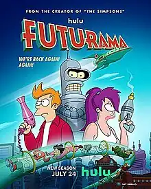 In February 2023, a release window was set sometime around the mid-2023 season.[26] On May 18, 2023, Hulu announced that the season would premiere on July 24, 2023. Hulu's sister streaming service, Disney+ announced, via a press release, that it would also stream the new season of Futurama internationally as a Star Original[28] Disney+ later announced that the season would premiere new episodes around the world simultaneously with Hulu in the United States.[29]