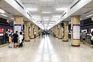 Fuxingmen Station (simplified Chinese: 复兴门站; traditional Chinese: 復興門站; pinyin: Fùxīngmén Zhàn) is an interchange station on Line 1 and Line 2 of the Beijing Subway.[1] It is named for Fuxingmen, a former gate in Beijing's city wall. The station handles over 170,000 transfers between Lines 1 and 2 per day.[2]