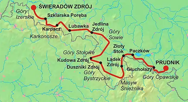| Trailheads | Świeradów-Zdrój 50.908333°N 15.333333°E Prudnik 50.319722°N 17.579167°E |