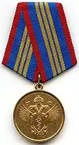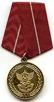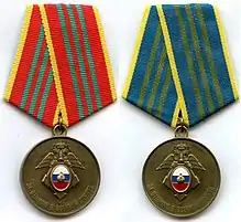Awarded to military personnel of the Directorate of Special Programs of the President of the Russian Federation for 15 years of good service. Inscription on reverse "ПРИ ПРЕЗИДЕНТЕ РОССИИ" (UNDER THE PRESIDENT OF RUSSIA). The 2016 order changed the ribbon from the previous military colours (left) to its present departmental specific colours (right).[13][19] |