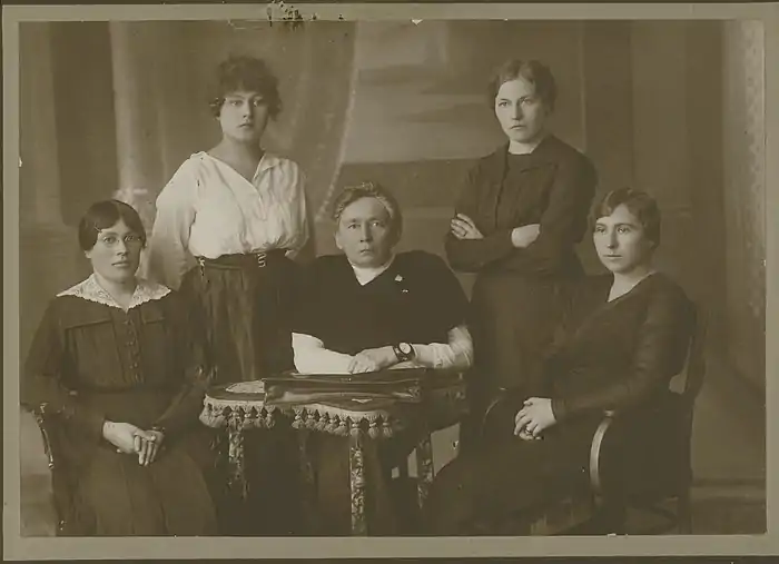 After her father's death in 1909, she lived in Vilnius but family duties followed her – she had to take care of her three nephews and an orphan that her family informally adopted.[9] In Vilnius, she worked as editorial staff of Lietuvos žinios.[10] In 1911–1912, she was the editor of Žibutė, a liberal supplement to Lietuvos ūkininkas that was geared towards the women.[11] Žibutė encouraged women to seek education and be active in social and political life. It was a liberal answer to the Catholic Lietuvaitė, which supported the traditional role of a woman as a housekeeper and published articles on proper women's etiquette and culinary recipes.[8] In total, she wrote some 400 articles to various newspapers.[12] During World War I, Petkevičaitė returned to her childhood home. She completed courses for doctor's assistant and, according to her father's wishes, helped the sick. During the war she kept a diary, which was first published in 1925 and 1933.[2] In the diary, she expressed support to Hugo Haase and Social Democratic Party of Germany.[4]
