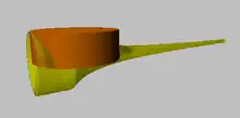 These colourful informal names and the allusion to religion came along later.[1] Torricelli's own name for it is to be found in the Latin title of his paper De solido hyperbolico acuto, written in 1643, a truncated acute hyperbolic solid, cut by a plane.[2] Volume 1, part 1 of his Opera geometrica published the following year included that paper and a second more orthodox (for the time) Archimedean proof of its theorem about the volume of a truncated acute hyperbolic solid.[2][3] This name was used in mathematical dictionaries of the 18th century, including "Hyperbolicum Acutum" in Harris' 1704 dictionary and in Stone's 1726 one, and the French translation Solide Hyperbolique Aigu in d'Alembert's 1751 one.[1]