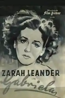 Gabriela is a 1950 West German musical drama film directed by Géza von Cziffra and starring Zarah Leander, Carl Raddatz, and Vera Molnar. It was Leander's comeback film after a seven-year absence from filmmaking. In 1943 when the Nazi leadership had demanded she take German citizenship, she had broken her contract with UFA and returned to her native Sweden. In the immediate post-war era she was banned from appearing in German films because of her previous association with the Nazi hierarchy. When the law was lifted in 1949, she was able to make films once more.